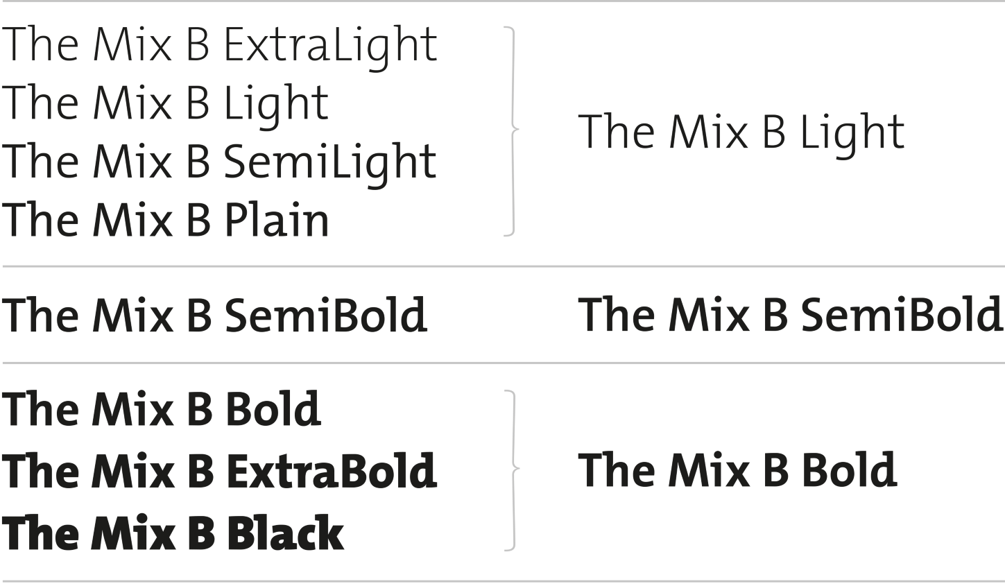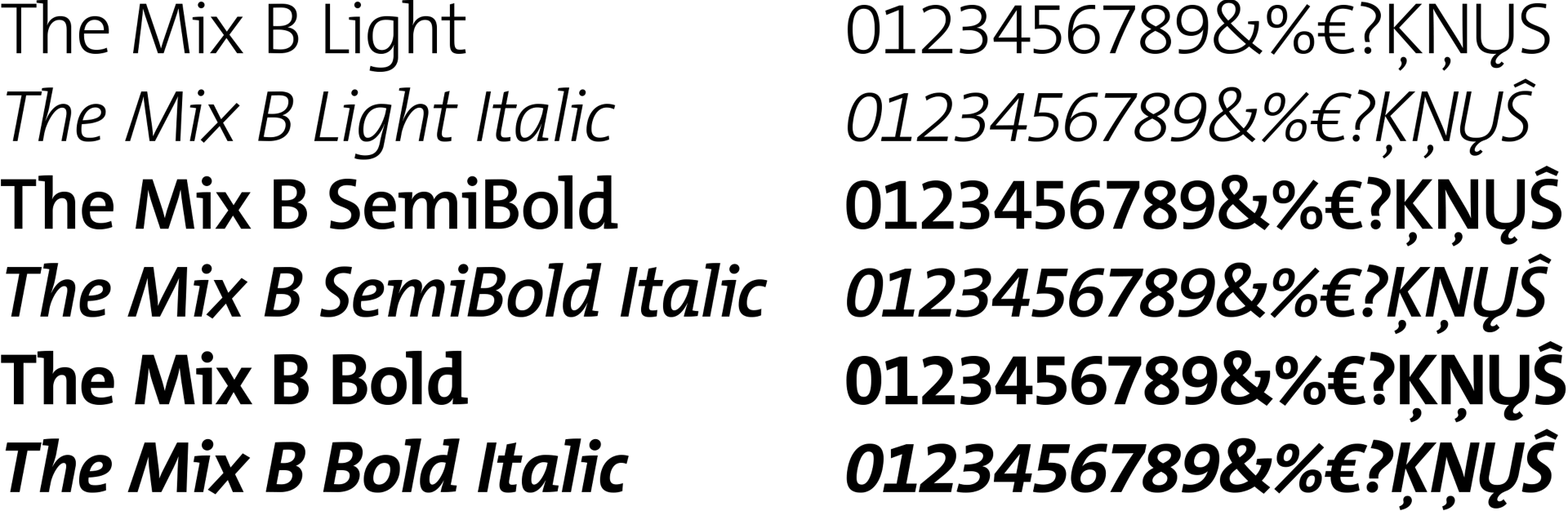 The Mix B Light is used for body text in every production - the other versions of the font can be used as subheadings, explanation boxes etc.