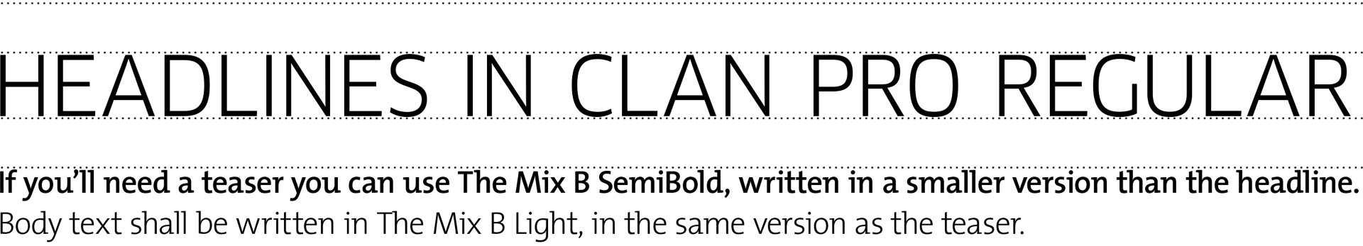 Headlines shall always be written in Clan Pro Regular in uppercase (capitals) with a suitable margin for the others elements around it. We would rather have too much air than almost none. Teaser text or body text shall be written in The Mix B in either SemiBold or Light as shown below: