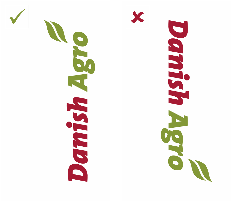 The logo is always oriented with the trademark uppermost and the reading direction from bottom upwards. The same applies to the payoff.