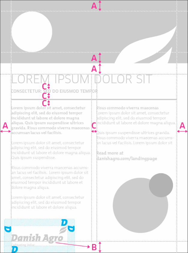 C is also used as vertical space between each element, if the ad has a small subheading and a line. If not, the measure of A shall be used, like shown under 'Margins'.