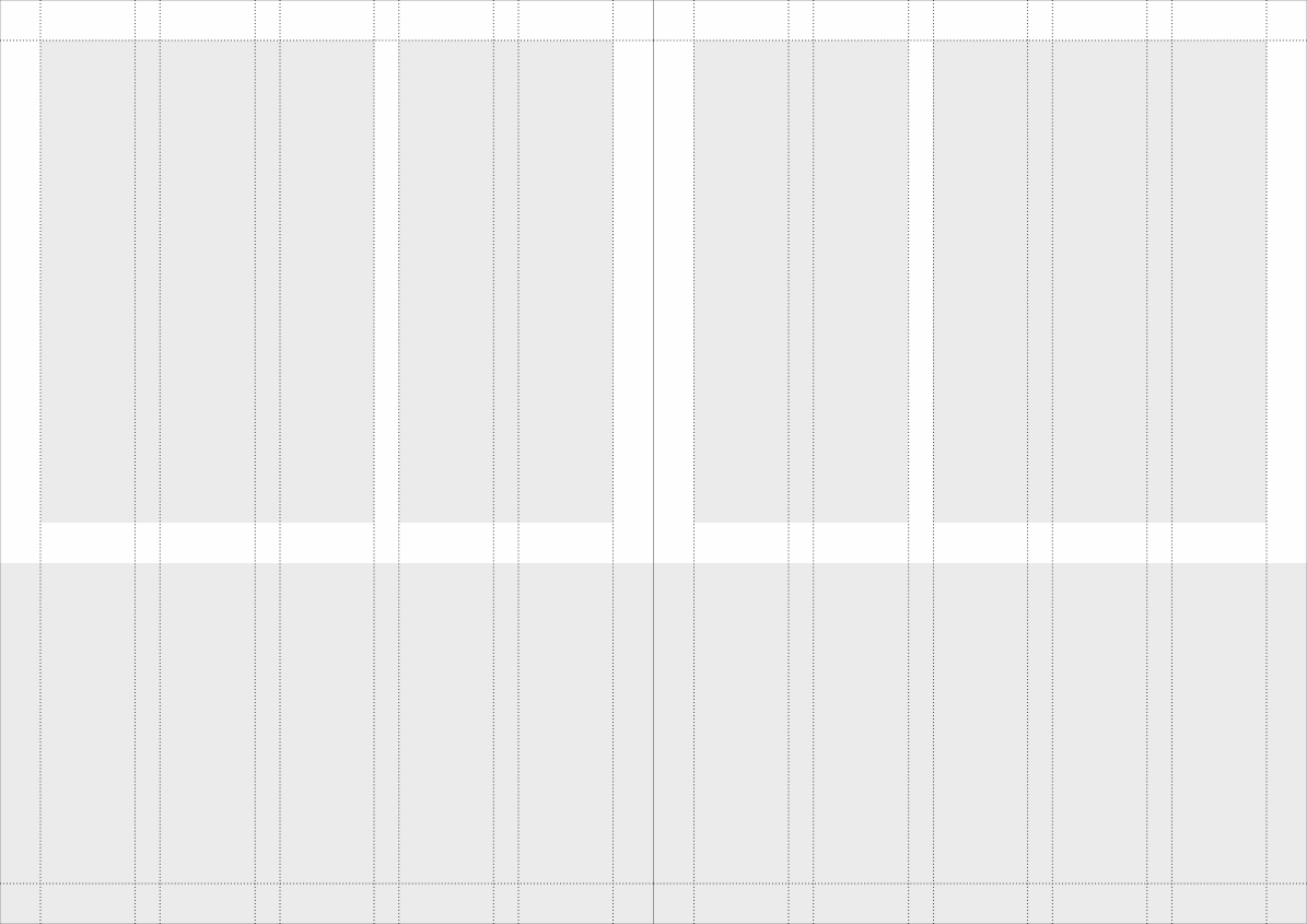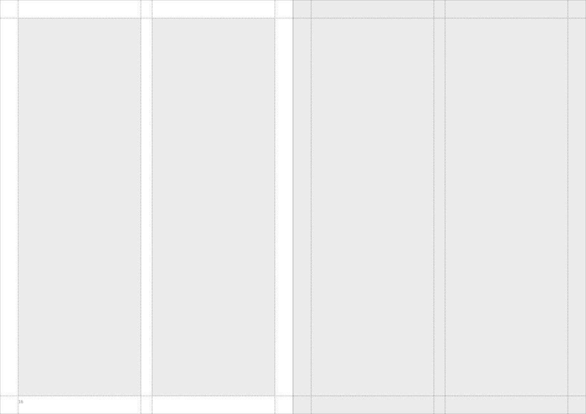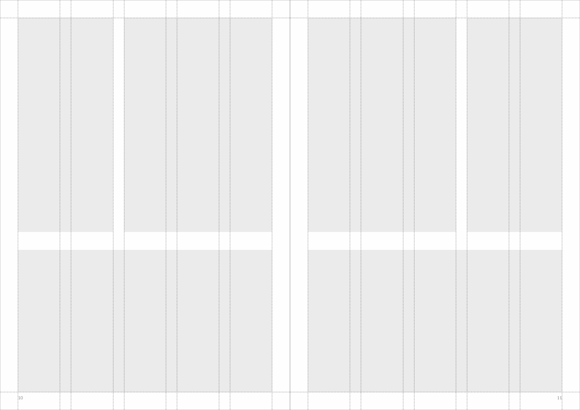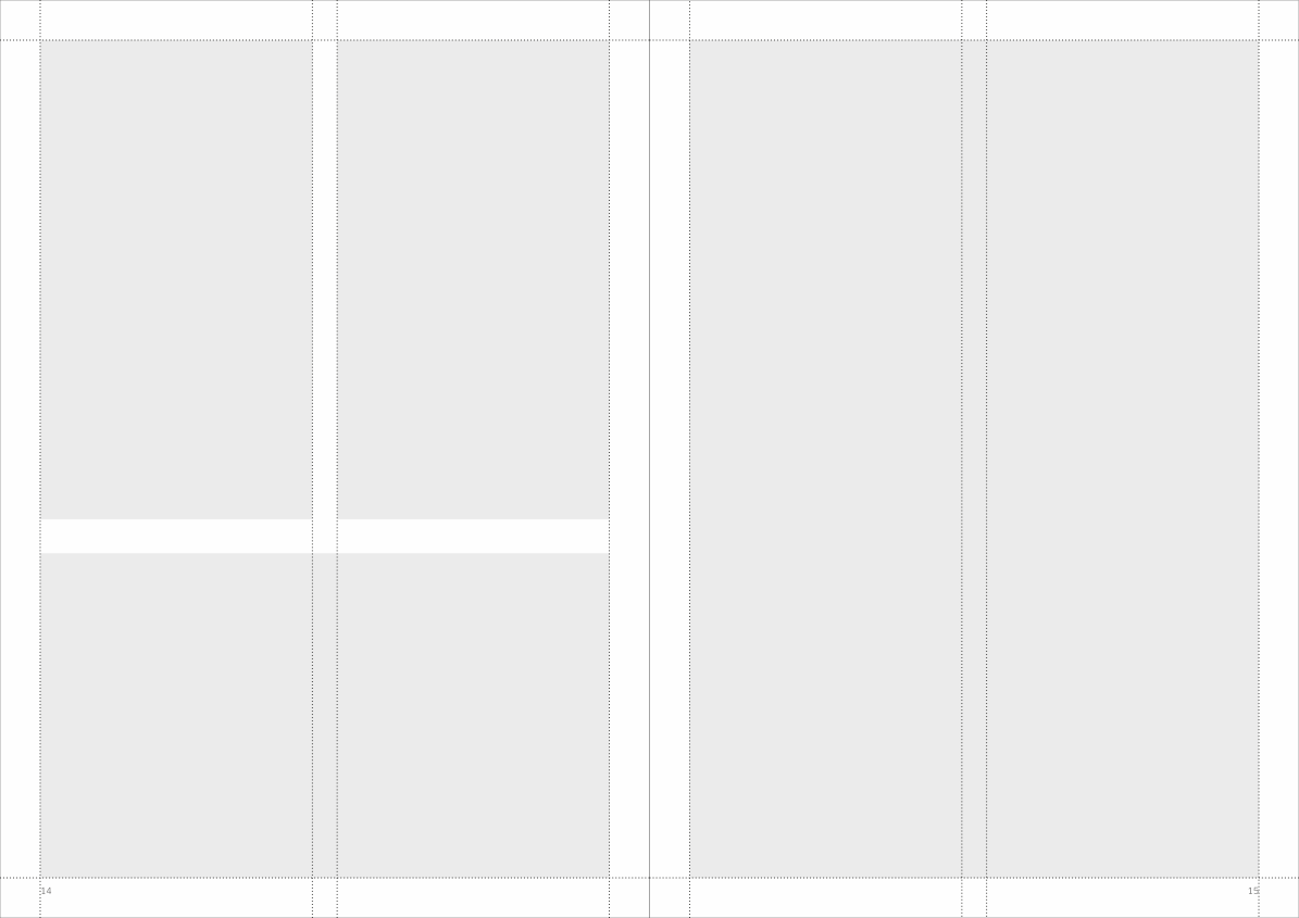 The basic design is built in a grid of either five or two columns. If you want to build the total brochure in either five or to columns - or a combination - is totally up to you. Just make sure that it is the same grid on both pages of the facing pages as displayed below.