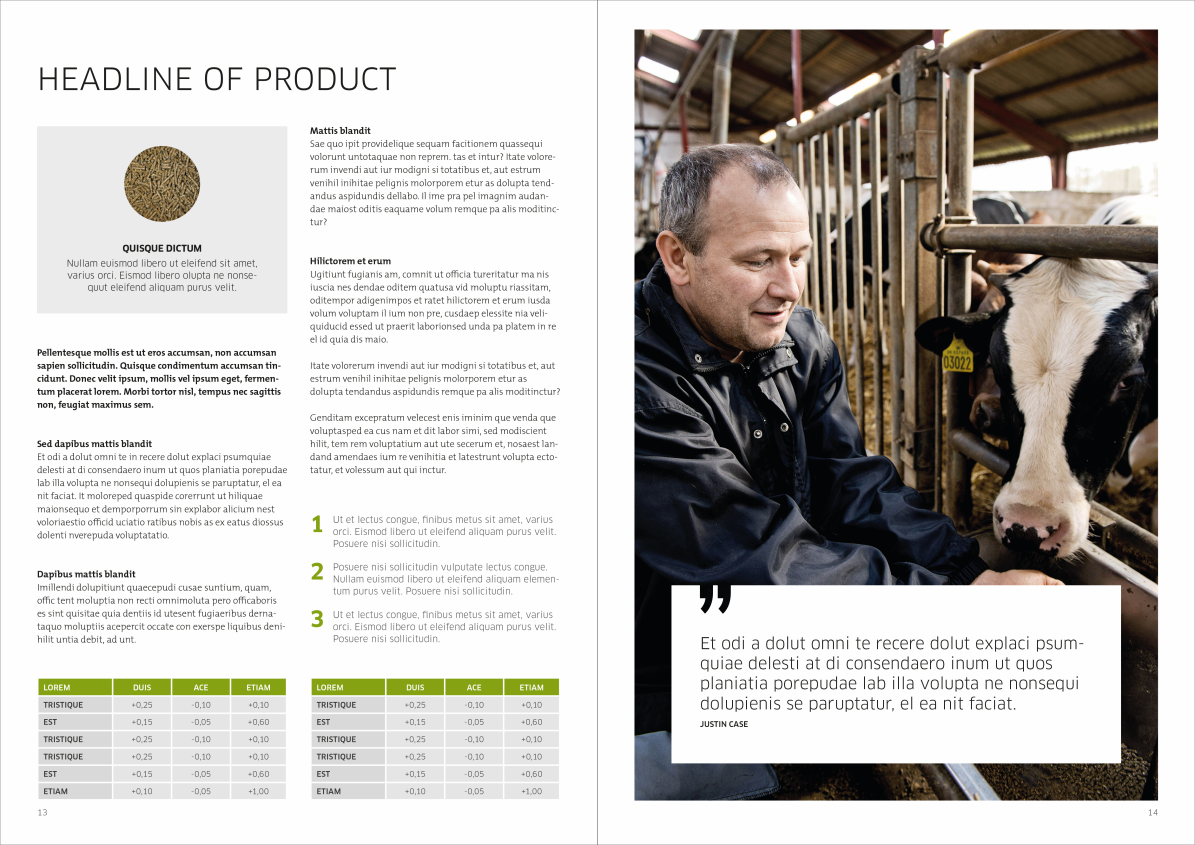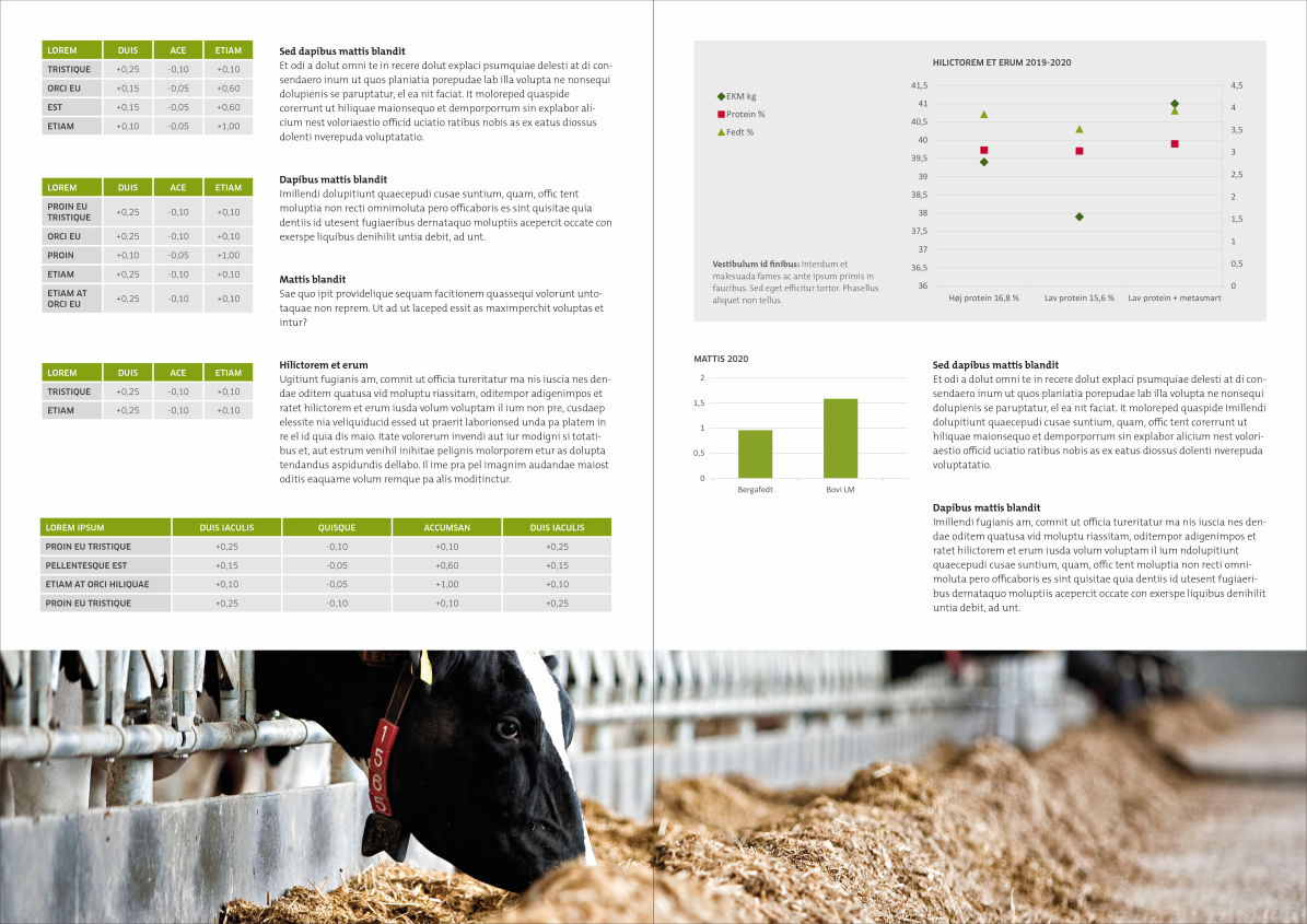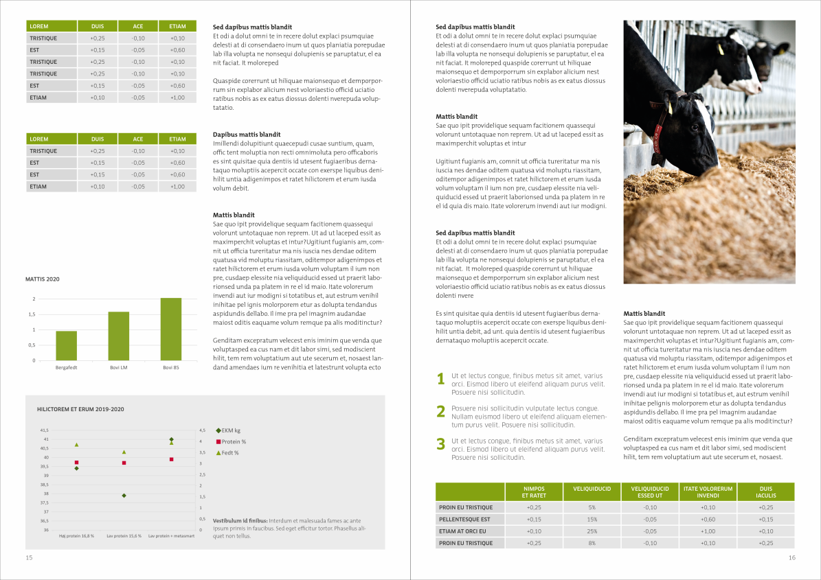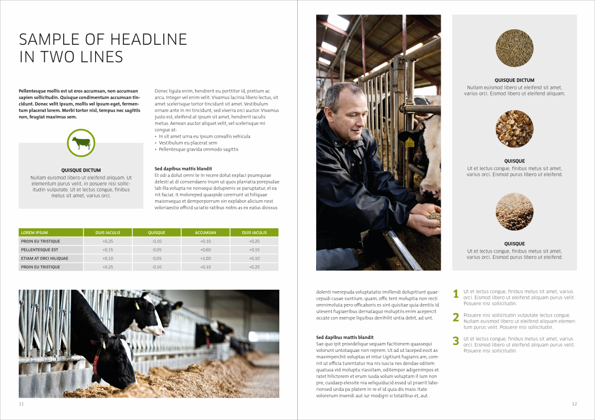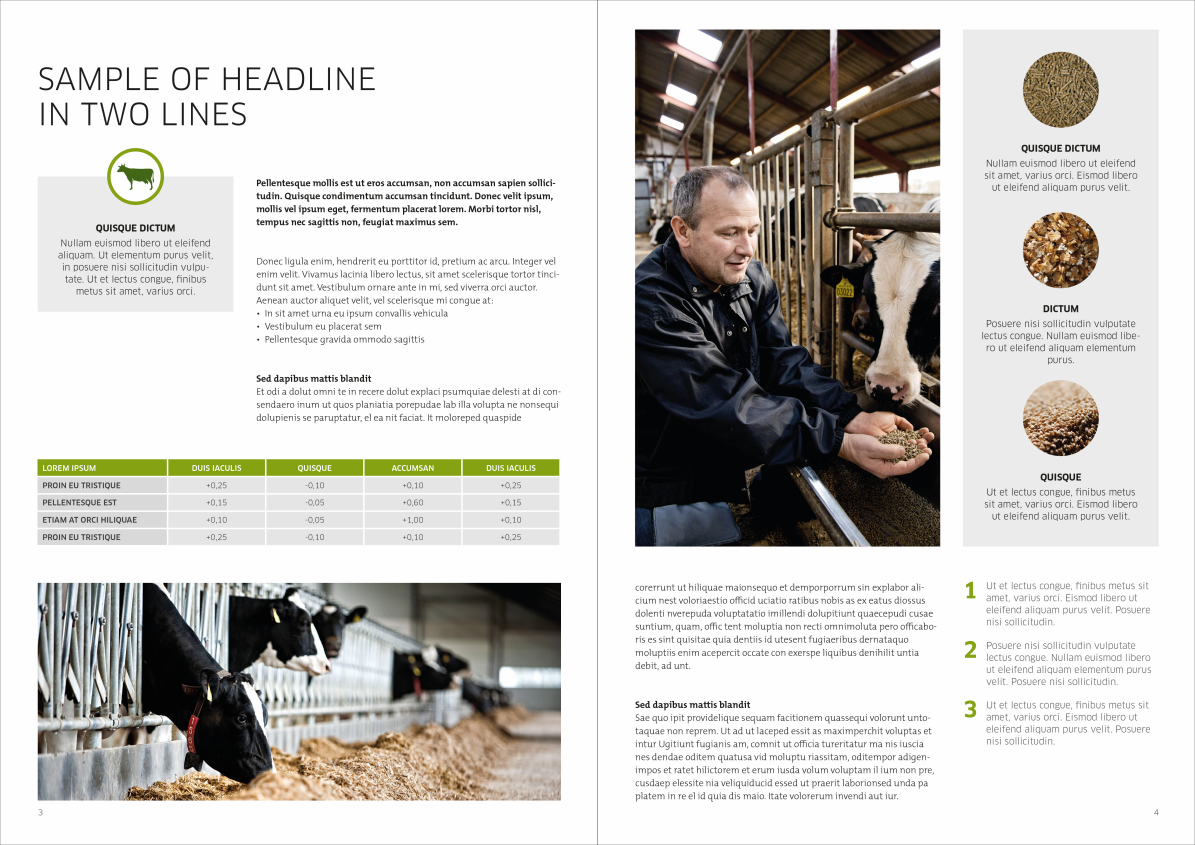 The basic design is built in a grid of either five or two columns. If you want to build the total brochure in either five or to columns - or a combination - is totally up to you. Just make sure that it is the same grid on both pages of the facing pages as displayed below.