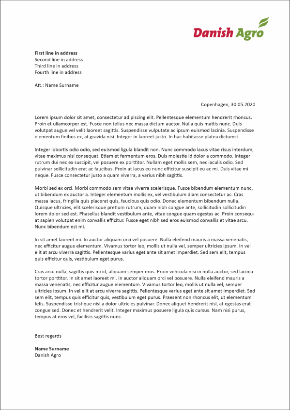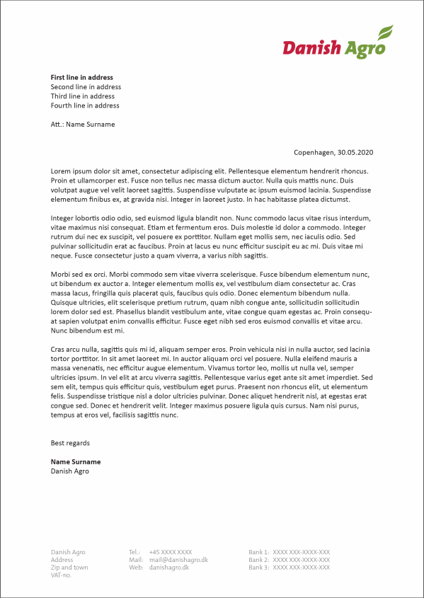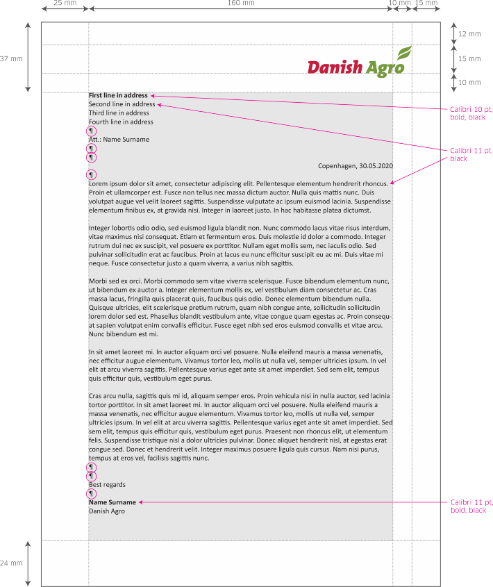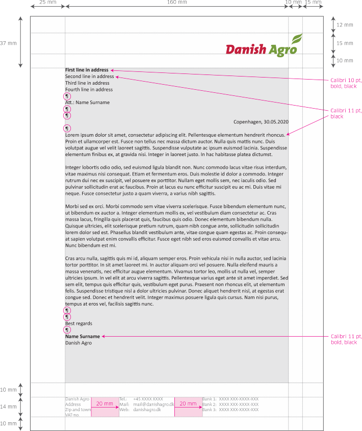 The logo shall be printed in Pantone colours and placed like shown below. The text in the footer shall be written in The Mix B, light, 9 pt, 60% Black and all body text shall be written in Calibri, regular, 10 pt, Black.