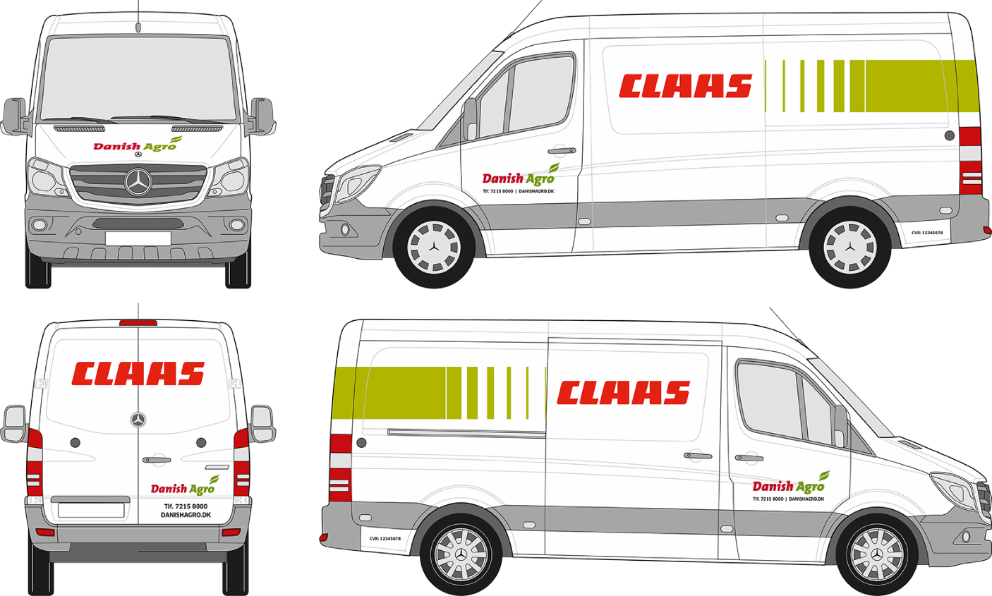 We use the basic design principles of CLAAS' designguide and place the CLAAS logo with the vertical green lines on the side of the cars. On the doors we have the company info with logo, phone and web address below, seperated by a pipe. On the rear we place the brand logo on both doors and the company info a the lower right corner.